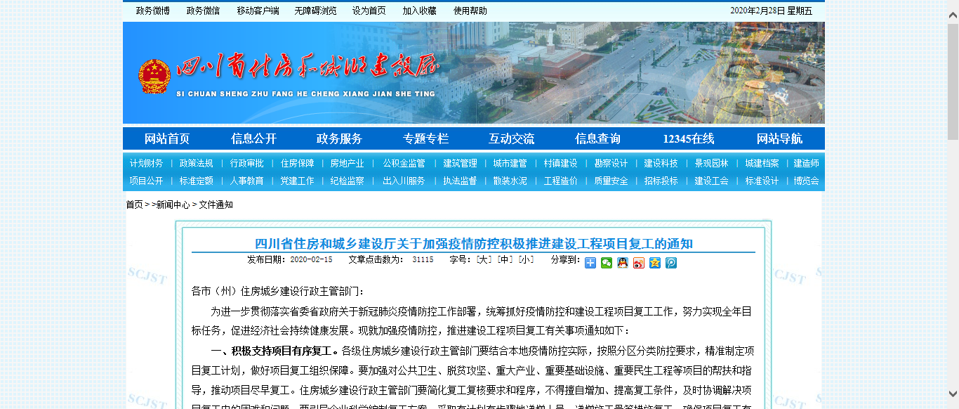四川省住房和城鄉(xiāng)建設廳關于加強疫情防控積極推進建設工程項目復工的通知