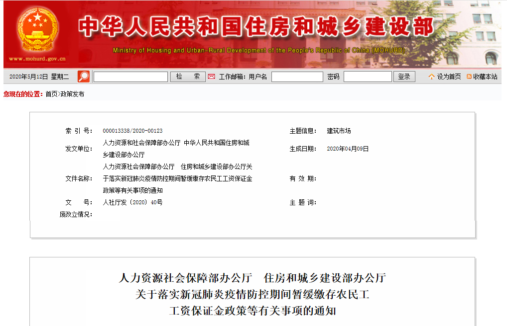 人力資源社會保障部辦公廳、住房和城鄉(xiāng)建設部辦公廳 關于落實新冠肺炎疫情防控期間暫緩繳存農(nóng)民工工資保證金政策等有關事項的通知 各省、自治區(qū)人力資源社會保障廳、住房和城鄉(xiāng)建設廳,直...