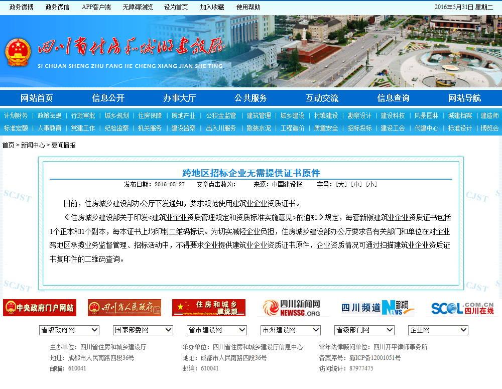 四川省住房和城鄉建設廳關于深化省建筑市場監管與誠信一體化平臺應用管理工作的通知 發布日期:2017-03-16文章點擊數為: 45318 字號:[大...
