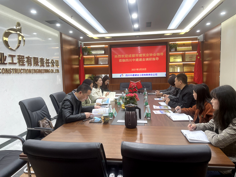 2021325日,成都市建筑業協會常務副會長劉杰、秘書長馬平、副秘書長劉凌云、辦公室主任賈娟一行四人到四川中建建業工程有限責任公司座談調研,公司副總經理薛濤及工程部、經營部、財務部、行政辦等部門負責人參加座談。