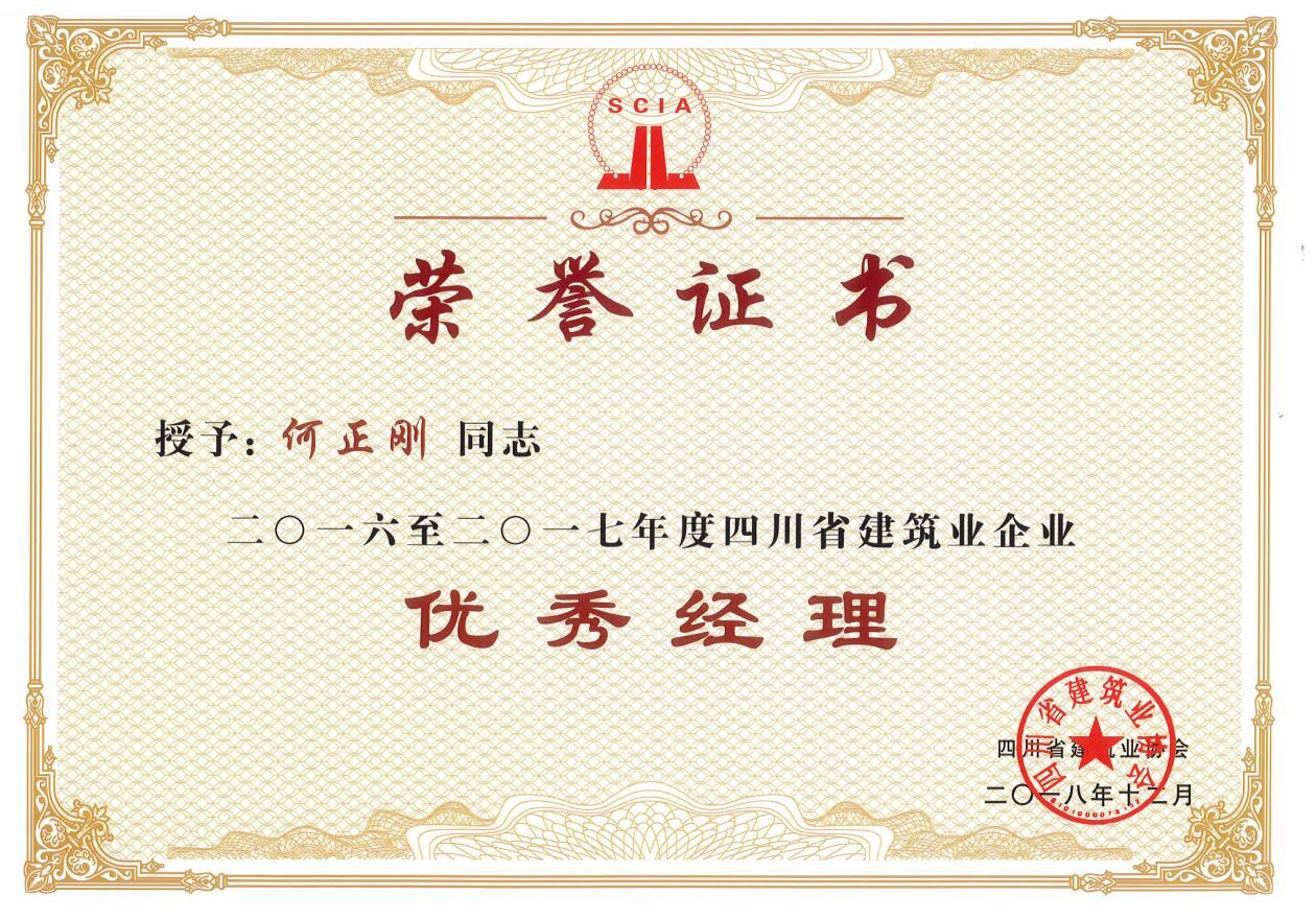 表彰會上,我公司被表彰為2016年度至2017年度四川省建筑業優秀企業、公司董事長兼總經理何正剛先生也獲得了2016至2017年度四川省建筑業優秀經理的光榮稱號。